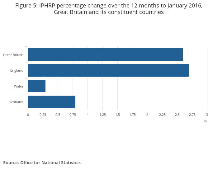 Figure 5: IPHRP percentage change over the 12 months to January 2016, Great Britain and its constituent countries